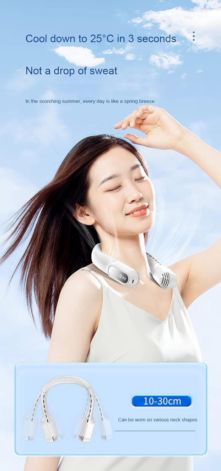 Specification:Double turbo design,360 °coolingProduct name: Protable bladeless ceiling neck fanMaterial: ABS + PCProduct size: 230*150*45mm/9.06x5.91x1.77 inchesProduct weight: 240gInput power: 5VBattery capacity: 3000mAhCharging time: about 3-5 hoursRunning time: 3-8h (depending on the use of scenarios and gears)Interface type: USBCharging port: Type-CBattery life: rechargeable USB-poweredPackage1x Bladeless neck fan1x USB charging cable1x Instruction manual